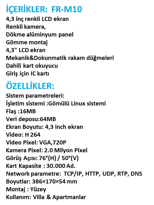 Dokunmatik Butonlu Görüntülü Kapı Telefonu Model 10, gömülü kurulumlu alüminyum panelli mekanik butonlu görüntülü kapı telefonudur. Model 10 reklam oyununu destekler. Genellikle intercom sisteminin yapımında kullanılır.