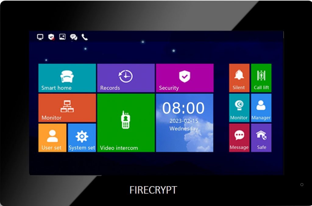 • Dokunmatik menü ekranı: Monitör/ Çağrı koruması/ Acil Durum/ Otomasyon/ mesaj/ fotoğraf kaydı/ Çağrı kaldırma/ Ayar/Alarm