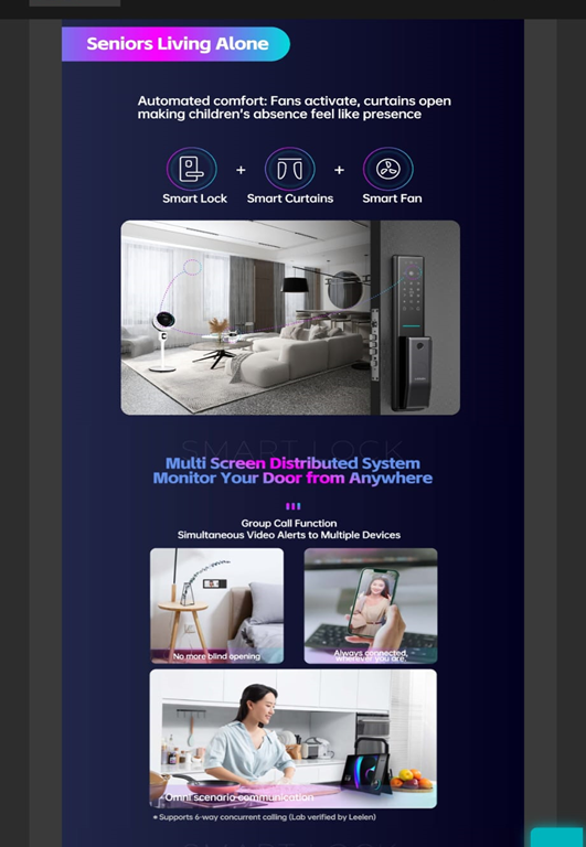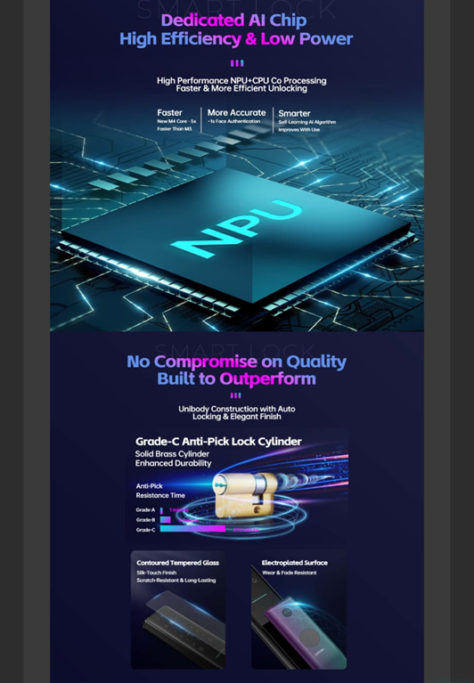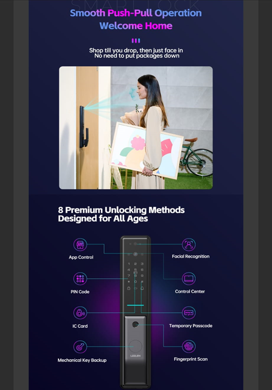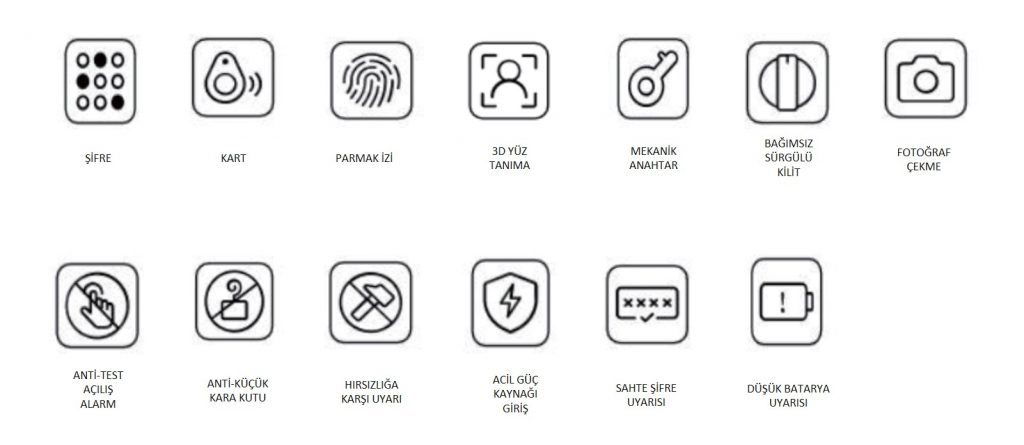 • Yüz tanıma, parmak izi, şifre, şifreli kart, anahtar ve düğme desteği, altısı bir arada kilit açma