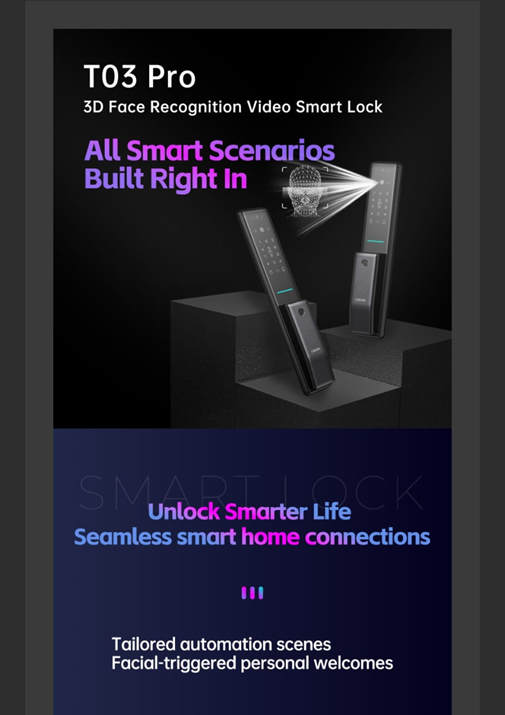 T03 Pro, konutlar için olağanüstü değer sunan, tam otomatik 3D yüz tanıma özellikli, görüntülü interkom akıllı kapı kilididir. Bu tam otomatik kapı kilidi, alüminyum alaşımından yüksek sıcaklıkta döküm yapılarak üretilmiş ve çeşitli işlemlerle titizlikle cilalanmıştır. T03 Pro, birden fazla kilit açma yöntemi için 3D yapısal ışıklı yüz tanıma özelliğinin yanı sıra algılama ve alarm özelliğiyle daha akıllı ve güvenli bir ev deneyimi sunar.