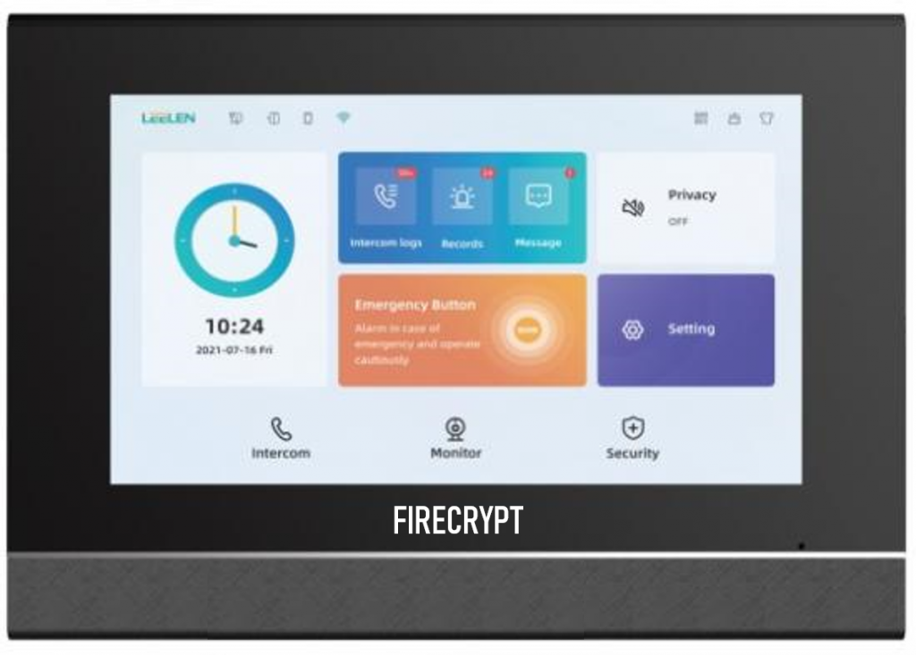 V52, kablosuz WiFi’yi destekleyen basit ve şık bir görünüme sahip 7 inçlik akıllı iç mekan monitör istasyonudur. Kapasitif dokunmatik ekran, kullanıcılar için oldukça uygundur. Esas olarak konut ev ve apartman interkomu, video gözetimi, güvenlik alarmı, bilgi yönetimi, akıllı kapı kilidi bağlantısı ve diğer işlevleri gerçekleştirmek için iç mekan girişlerinde kullanılır.
